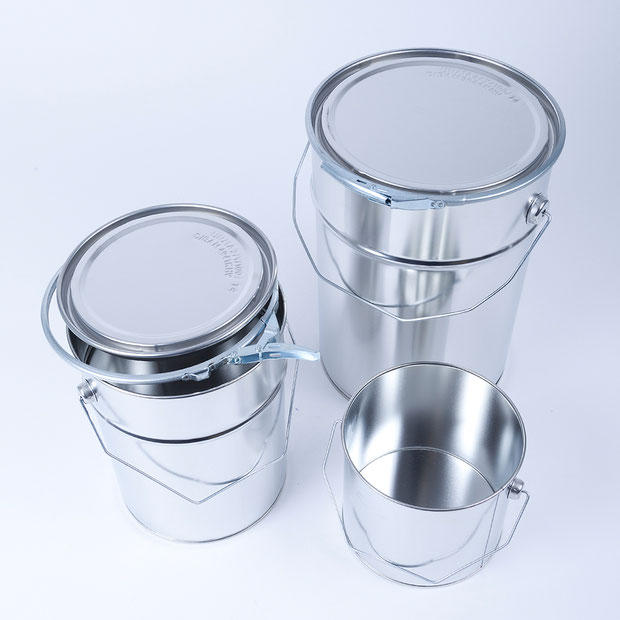 Eindrückdeckeleimer aus Weißblech mit Tragebügel sind als leere Blechverpackung in nahezu allen Größen konisch geformt und können so ineinander gestapelt platzsparend transportiert und gelagert werden Diese äußerst vielfältig verwendbaren Gebinde mit Zulassungen für den Transport gefährlicher Güter nach RID/ADR und UN werden überwiegend mit einem Deckel und einem Spannring sicher verschlossen. Außerdem gibt es Ausführungen mit einem Lappendeckel als Verschluss, der maschinell verschlossen wird